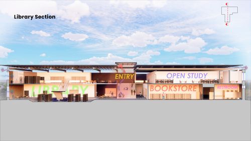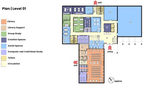 Space Planning: The internal layout is structured across two levels, organized to balance quiet study areas with vibrant social and collaborative spaces. The ground level includes public-facing programs such as the library, cafe, art gallery, multi-purpose rooms, a media lab, and an auditorium that supports both academic and cultural events. The upper level houses the main collections, study zones, creation spaces, and specialized studios, including a broadcast and recording suite, music room, and innovation lab, providing students and faculty with a diverse range of resources. Flexibility is embedded in the planning, allowing rooms to be reconfigured for future needs and interdisciplinary use.