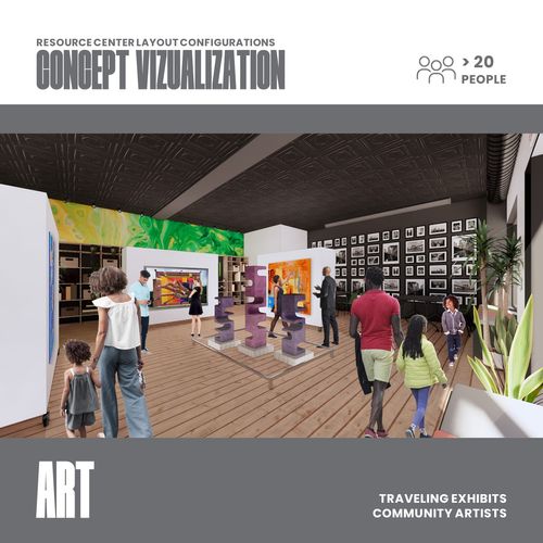 These renderings are not just plans; they are a promise of what our Resource Center will offer to the community—a place where collaboration, celebration, history, resources, and art come alive. Through thoughtful design and community input, we are crafting a center that not only meets the diverse needs of our community but also inspires a new way of thinking about what communal spaces can achieve. Join us as we embark on this journey to create a space that truly belongs to everyone, a space where every visit enriches, engages, and empowers.